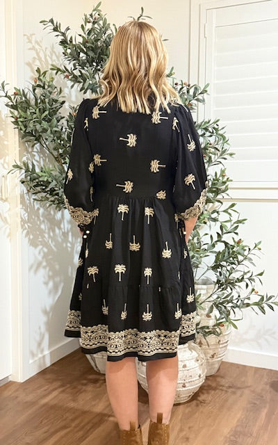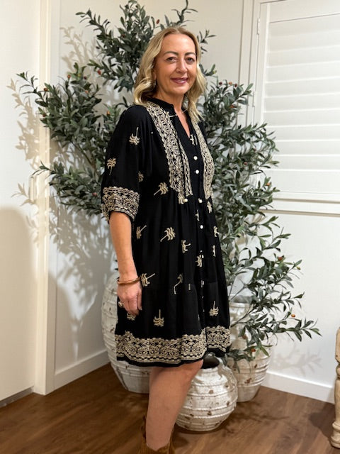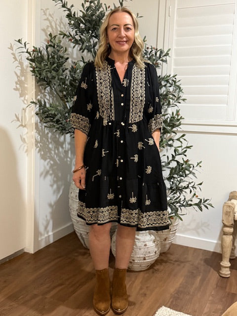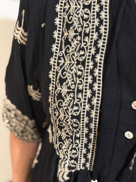 Dahlia midi has a button detail to the top with a pleated skirt line and pockets. Very flowy and oversized fit. Dreamy to wear and loving the embroidered detail.